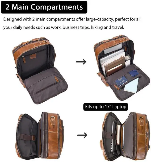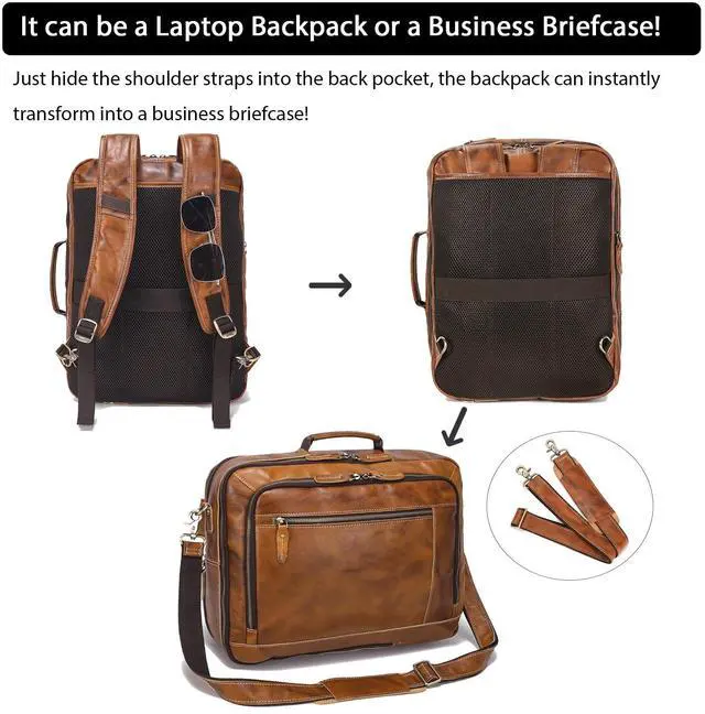 straps: 15"- 33" / 38-84cm. ^^ Premium QualityThis leather laptop backpack is made of full grain cowhide leather (genuine leather thickness 2.0 mm). This vintage-inspired men's expandable travel bag ensuring long-lasting use and protection for your items. Shoulder straps soft padding and a breathable back panel provide enhanced comfort during extended wear. ^^ CONVERTIBLE DESIGNThis leather travel backpack for men is designed with hidden padded shoulder straps that can be easily stowed into the back panel, converting this backpack from a carry on bag to a briefcase style, providing you with more flexibility in carrying experience. And Luggage strap on the back of this rucksack can hold the backpack on a rolling luggage to make your travel easier. ^^ Organized Compartment DesignThis leather expandable backpack has 4 compartments contain 10 inner small pockets, 3 pen slots, 3 card slots, 1 laptop compartment, 1 tablet compartment, 1 hidden back pocket. Holds 16" laptop, tablet, A4 documents, phone, wallet, water bottle, umbrella, daily necessities and clothes. Ideal for daily work, 2-3 day business trips, weekend trips. ^^ One Year Warranty, please contact us if there is any question about this genuine leather backpack, just feel free to contact us, we will reply you with solution in 1 business day.