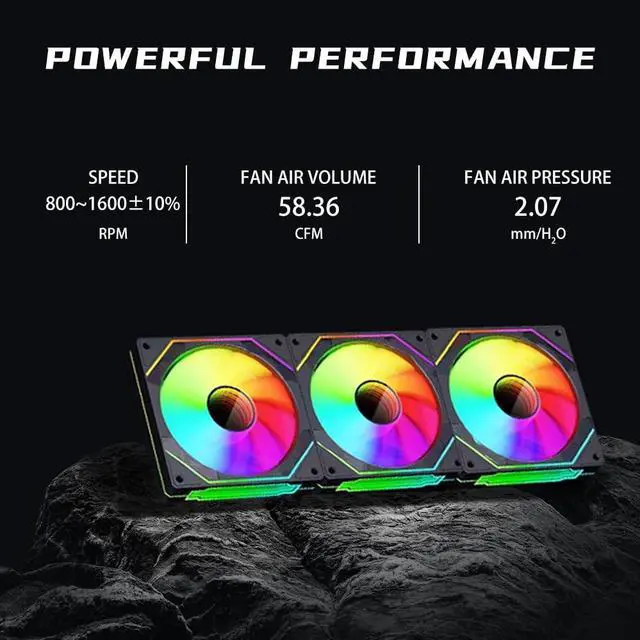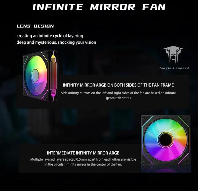 Three sided Infinite Mirror ARGB light effect The side infinity mirrors on the left and right sides of the fan are based on infinite geometry Multiple layers 0.5 mm apart are visible in the circular infinity mirror at the center of the fan ^^ Support +5V 3 PIN ARGB motherboard divine light synchronization ^^ High wind and low noise fan blades Balanced 9 blade design, increase the output wind pressure Improve the efficiency of heat dissipation, easily blow away the excess heat of the host, 1000~1650RPM; 29DBA ^^ Hydraulic bearing Ensure high speed operation, reduce wear, reduce noise, improve service life The bottom of the fan has a magnetic suction, which attracts the steel column on the fan page and has a strong suction force ^^ Double-sided shock pad The silicone cushioning pad can effectively reduce the noise caused by resonance when installed on the chassis ^^