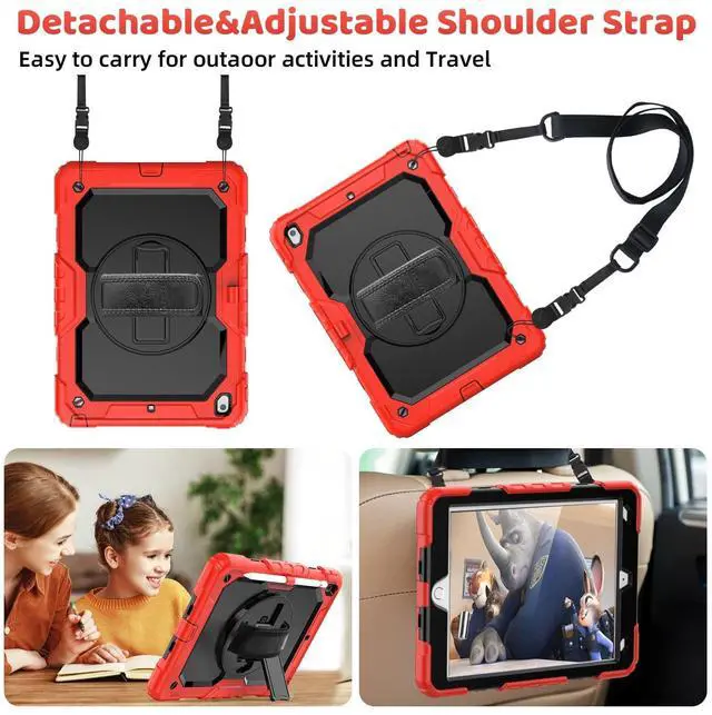 Removable Shoulder Strap: Attach the strap to any two corner holes of this iPad 10.2 Case and it will allow you to display your iPad behind car head rest for easy personal viewing or between two seats for shared viewing. It is also a unique design for kids walking/travelling, architecture designers, real estate agents, construction workers as well as outdoor labor ^^