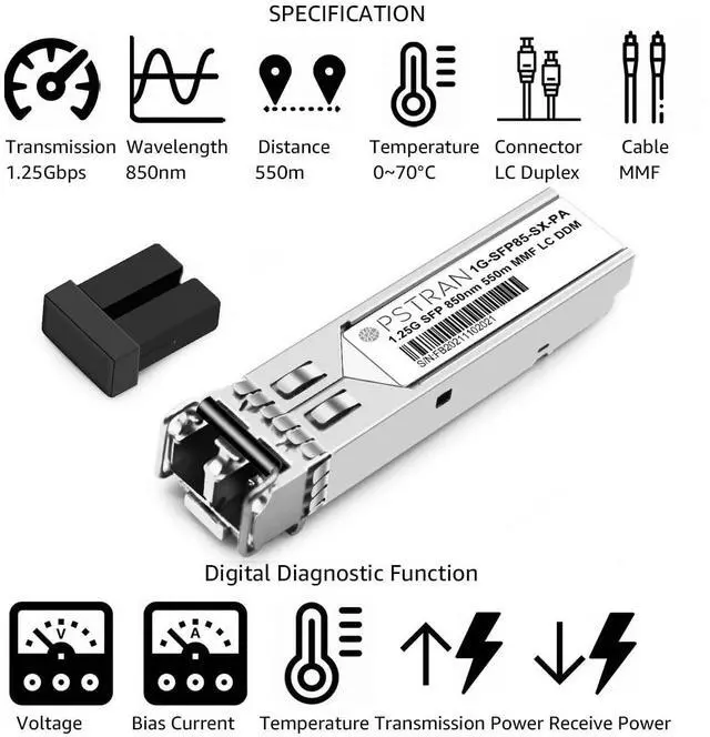 the 1000BASE-SX SFP Optical Transceiver Module supports up to 550m link lengths over multi-mode fiber (MMF) using a wavelength of 850nm via an LC connector. Max. Power Consumption 0.8W Allowing for Prolonged Service Life, Commercial Temperature Range 0 to 70C (32 to 158F) ^^ Tested in Targeted Switches for Superior Performance, Quality, and Reliability. We owns compatibility LAB facilities to meet the EEPROM coding and writing requirements with various brands of the latest and advanced networking equipments to ensure the compatibility. ^^ Real Time Digital Optical Monitoring Capability for Strong Diagnostic Capabilities ^^ Hot Pluggable SFP MSA and RoHS Compliant to Maximize Uptime and Simplify Maintenance ^^ Compliant to IEEE 802.3 z Gigabit Ethernet and SFF-8472 with duplex LC receptacle