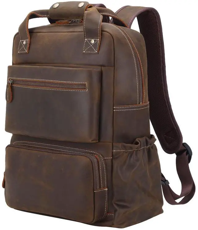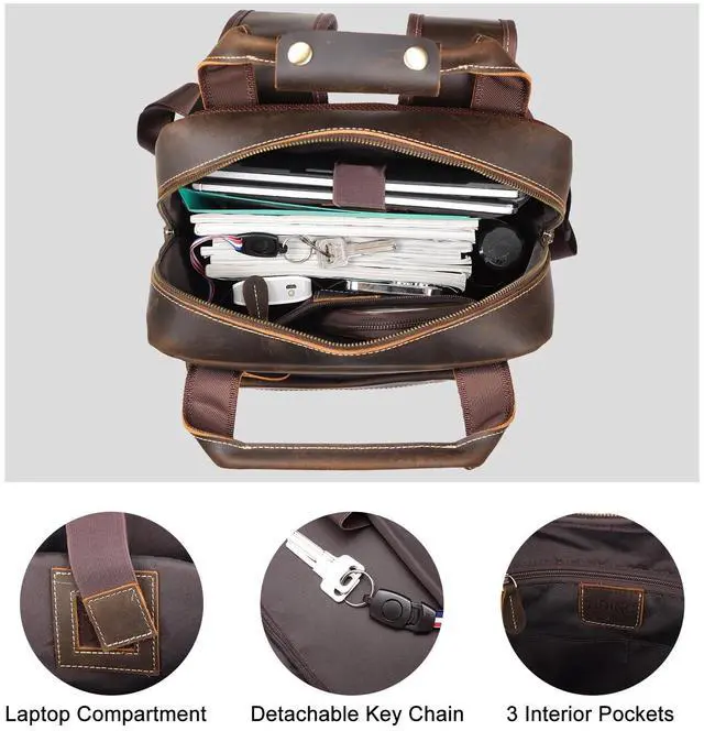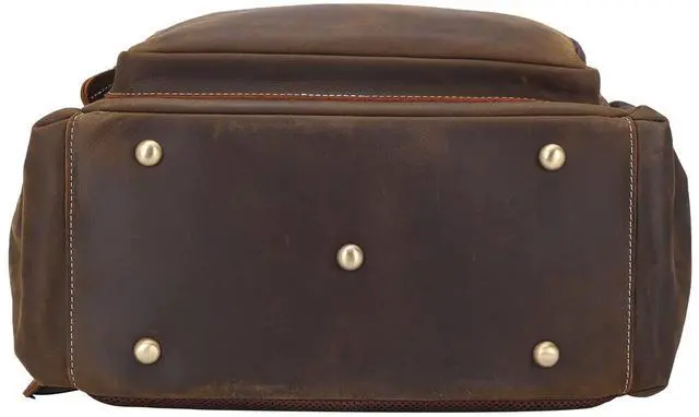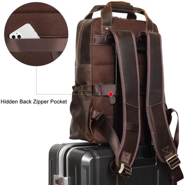TSA Approved & Luggage BeltSize: 12.4" (L) x6" (W) x17" (H); weight: 3.75 lb(a bit heavy due to thick leather and hardware, but shows its durability). The luggage belt fit over the handle of your carry-on luggage, making your trip easier. Perfect carry on backpack for seamless business travel or weekend trips. ^^ Secure & Ample StorageThis large leather backpack with 7 outer pockets and 3 inner pockets, which can keep your items organized. Perfect for a work backpack or travel backpack, with separate laptop compartment fits 15.6 /16 Inch laptop and 2 expandable side pockets for water bottles. The hidden back zipper pocket is perfect spot for passport or other valuables during travel. ^^ Comfortable and Bottom ProtectionMesh back panel provides comfort and air circulation. The shoulder straps are well padded and easily adjusted, stay comfortable to carry throughout all day. The metal feet at the bottom protect it from wear and tear on the ground. Ideal for work, daily commuting, business travel, overnight, outdoor camping. ^^ Purchase with ConfidenceWe provide 1 year quality commitment and excellent customer service! If you have any problems with our products, please reach us and we take care of all quality-related issues