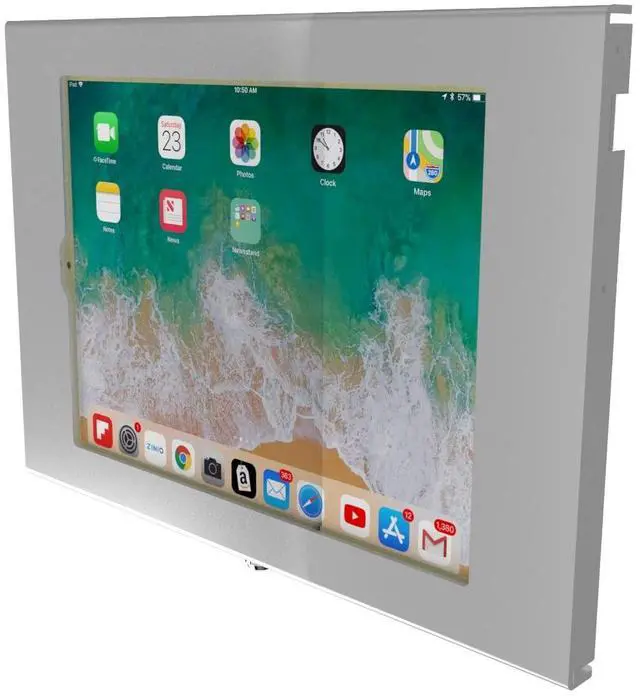 Material: Aluminum, Dimension: 254mm (Height) x 30mm (Depth) x 363mm (Width), Weight: 2.1 lb ^^ Used as Time Clock, POS, Kiosk, Store Display, Trade Show display ^^ Total Screen Access For Full Touch Function, Install In Seconds! One Push Button Lock, Anti-theft security design ^^ Wall Mount Ready! Supports VESA mounting kit with 75mm/100mm standard for both Landscape and Portrait Display Modes. Bundled with 90-degree USB C charge cable