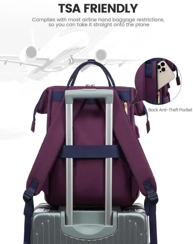 TSA-certified design ensures travel backpack fast security checks, complies with all airline carry-on standards, it can be placed in the overhead bin or under the seat on the plane. ^^ [USB Charging & Waterproof Protection]Crafted with high quality waterproof materials, this computer backpack shields contents from sudden downpours or spills. Exclusive shock-absorbing padding with breathable fabric safeguards devices from drops while preventing heat buildup. Laptop backpack women built-in USB charging port (power bank not included), you can easily charge your devices everytime. ^^ [Ergonomic Design Carry On Backpack]Engineered for prolonged comfort, the laptop bag women features breathable mesh shoulder straps help reduce back strain during long walks.