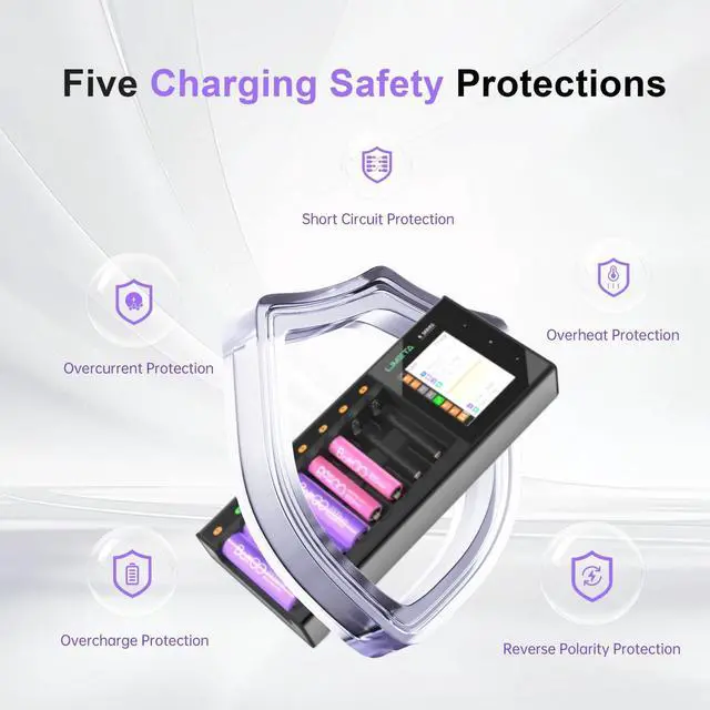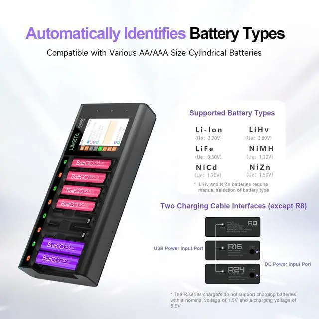 Compatible with: 1.2V Ni-MH/Ni-Cd, 1.5V Ni-Zn, 3.7V Li-ion, LiHV, and LiFePO4 batteries. ^^ [Color LCD Display] Equipped with a large color LCD screen and LED indicators, it clearly shows realtime charging/discharging status for each battery. Multiple display layouts make it easy to monitor battery conditions. Screen brightness is adjustable. ^^ [Convenient & Stable Charging] Includes a DC power cable and a widevoltage adapter for stable, reliable charging.