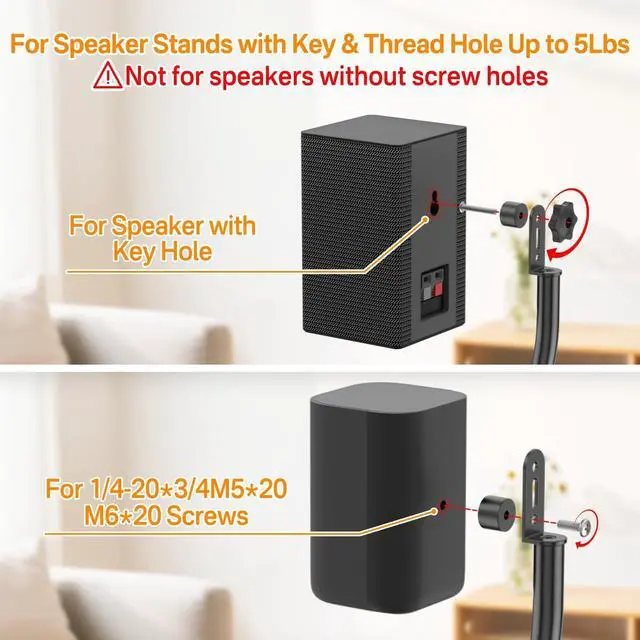 Conditional Compatibility: The surround speaker stands effortlessly connect speaker with thread holes fit for 1/4-20*3/4, M5*20, M6*20 screws and keyhole speakers, the rear speaker stands is suitable for Samsung, Vizio, Sony, TCL, Roku, Logitech, JBL, Klipsch, Polk and more speakers up to 5 lbs.