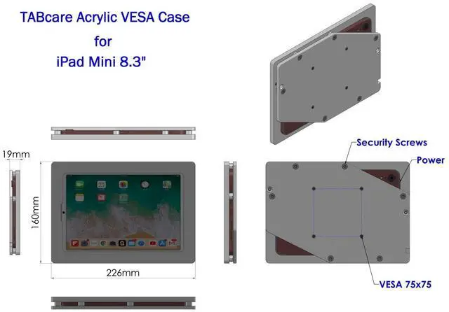 Compatible with iPad mini 6 8.3" 2021, mini 7 2024 supports VESA 75x75mm Standard, fits Square CC Reader,. Easy Access to all Buttons and I/O ports, tablet can be charged while in use ^^ Made of museum quality acrylic, Anti-theft design secured by security screws, used as Kiosk, POS, Store Display, Time Clock, ^^