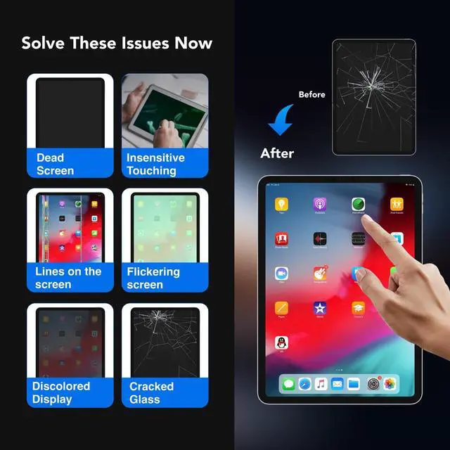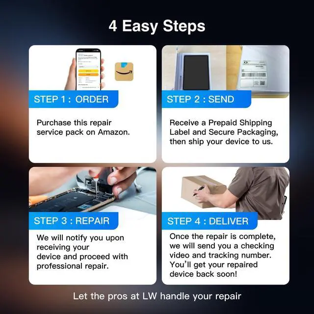 STEP 3: Wait patiently. Your Screen Repair will be finished by the 2-3 business day after we receive it. Afterwards it will be returned to you. Additionally, we offer a 30-day coverage for non-artificial damage and non-water damage on screens we have repaired. ^^ Unique Screen Replacement Service From LW service pack, you will get free screen repair service. This service is designed to address the problem for the most people, who attempt to replace their screens themselves, but causing damage to their device. What's more, our expert repair team will assist in screen replacement and conduct a thorough maintenance check for your device. ^^ Advantages of LW Service Pack 1. Significantly less expensive than local phone repairing stores. 2. We repair your device with expertise and precision. Rest assured, we never access or factory-reset your data. Instead, we prioritize preserving your data and device settings. 3. Prevents customers from attempting DIY replacements of damaged devices and screens, avoiding financial losses. 4. We provide 100% ORIGINAL LCD SCREENS. 5. We have multiple color models for the iPad to choose.