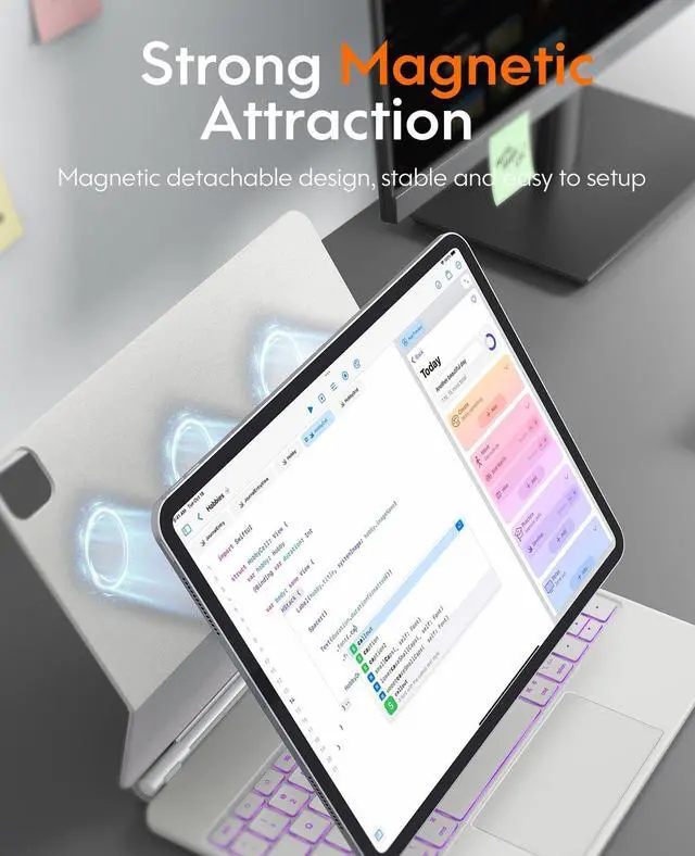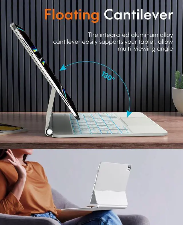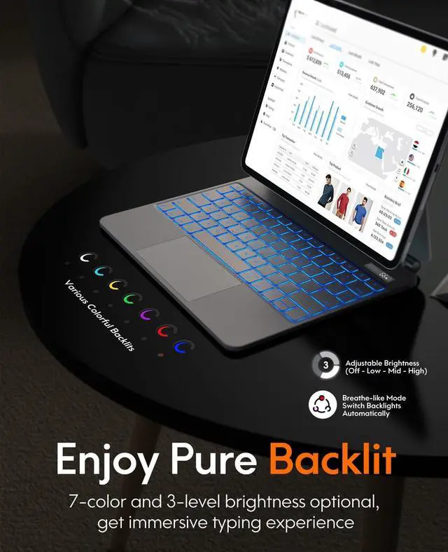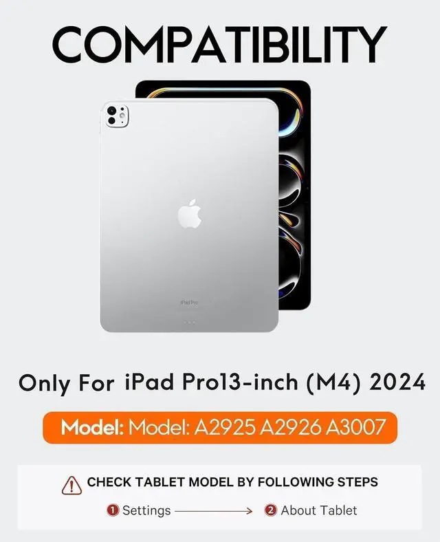 COMPATIBILITY -- This magic style keyboard case is only compatible with iPad Pro 13 inch (M4) 2024 (Model: A2925/A2926/A3007), note the model number on the bottom of the back of iPad. Tablet and Apple Pencil don't include. ^^ POWERFUL MAGNETIC ATTRACTION -- Built-in strong magnet, it can instantly attach and hold your tablet from falling. Floating Cantilever stand supports smoothly installing or removing tablet, which is convenient to use in vacation, learning or business. ^^ MULTI-TOUCH TRACKPAD -- Equipped with a multi-gesture touchpad, this new pro 13 keyboard allows users to interact with iPad in a more intuitive way. With multi-functional shortcut keys, it provides an efficient and convenient laptop-like experience. ^^ VARIOUS BACKLITS WITH BREATHE-LIKE MODE --7 different backlight colors for iPad Pro 13 (M4) keyboard, which helps you to use it even in low light conditions. Press fn & cmd to change the levels of the brightness. (off/low/mid/high/breathe-like mode). If you choose the breathe-like mode, the color will automatically switch. ^^ DIGITAL DISPLAY SCREEN -- The display status includes power, caps Lock, charging, and wireless connection status. It makes it easier for you to know whether it has been turned on or not, whether the Caps Lock function is turned on or not, whether the wireless connection is successful or not, and how much battery power is left or need to recharge the keyboard.
