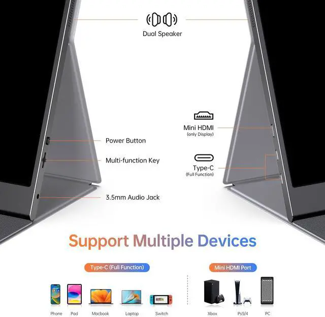NOTE: Your device should support Thunderbolt 3.0 / 4.0 or USB 3.1 Type C DP ALT-MODE. It is compatible with all devices equipped with HDMI and USB Type-C ports like laptops, PS, XBOX, SWITCH game consoles. ^^ Full HD Portable Monitor - 15.6 inch portable laptop monitor with 1920*1080 resolution, advanced IPS Matte screen support 178 full viewing angle, it renders accurate and bright color, draws you into the video or game with lifelike colors and amazing detail. It can effectively reduce blue light radiation damage, no flickering, eye-care, and make it easier to watch for a long time. ^^ Ultra-slim Portable Monitor - As a portable external monitor, Forhelp portable laptop monitor's body is made of aluminum alloy, the weight of the whole machine is 1.52 lb, 0.3" ultra-thin profile, can easily fit into your bag, so you can carry it with you. With our magnetic smart holster, you can use and store it anytime. ^^ Able to Balance Work and Play - With multiple display modes [copy mode/extension mode/second screen mode]. During meetings, it can copy your laptop's content as a second screen to share with others.