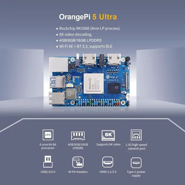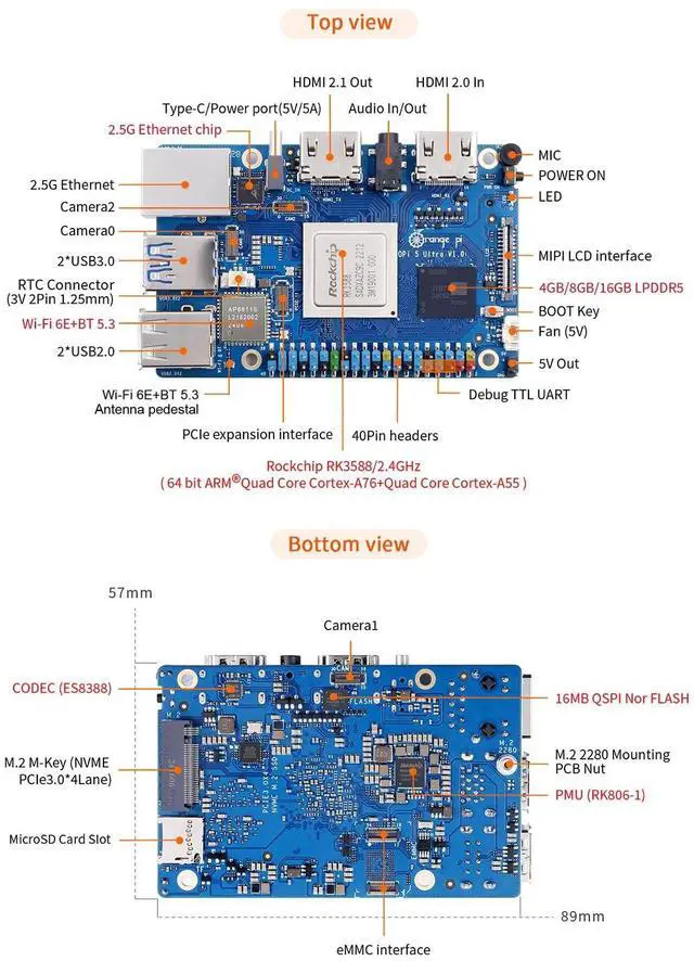 Hardware ParametersMaster Chip: Rockchip RK3588 (8nm LP process) CPU8-core 64-bit processor4 Cortex-A76 and 4 Cortex-A55 with independent NEON coprocessorCortex-A76 at 2.4GH z, Cortex-A55 at 1.8GH zGPU