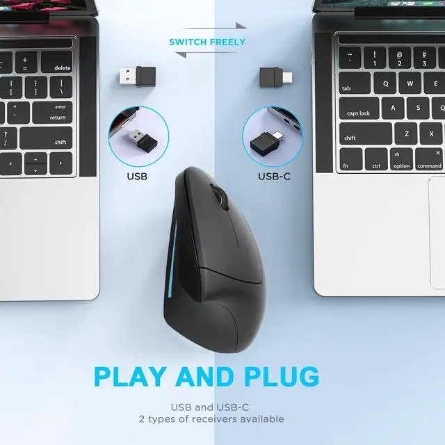 [2024 New Upgrade Support Efficient Multiple Working Modes] 3 Modes ergonomic Mouse(BT + 2.4GH z USB & 2.4GH z Type-C), Dual-Port Receiver, Compatible with USB and typeC port devices; Bluetooth Mode supports Bluetooth 5.0 and Bluetooth 3.0; Upgraded Computer Mouse is compatible with a wide range of devices, and can be switched freely.