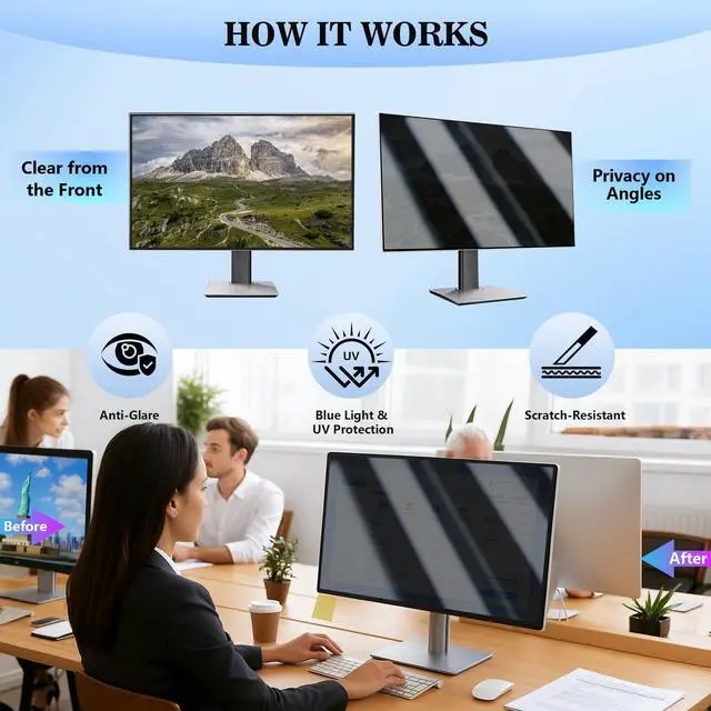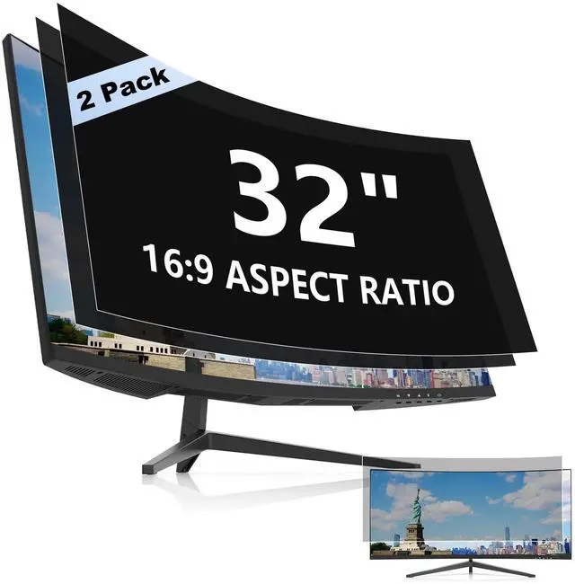 widescreen monitors (Dimensions: 27 7/8" W x 15 11/16" H), computer privacy screen 32 inch fits for Dell, HP, Samsung, Lenovo, LG, Acer, ASUS, and more (not compatible with Apple monitors). Measure your monitor's width and height before ordering for a precise fit, as diagonal size alone can be misleading. Ideal privacy screen for monitor ^^ Enhanced Privacy Protection Using advanced microlouver technology, computer screen privacy shield 32 inch ensures superior privacy, darkening the screen from 30 side angles and achieving full anti spy privacy at 60. Only those directly facing the monitor screen privacy see a clear display, perfect for securing sensitive data in public spaces. Adjust brightness for customized privacy screen for computer protection ^^ Eye and Screen Protection This 32 inch privacy screen for monitor blocks 99% of harmful UV eye protection rays and 98% of blue light, acting as a blue light screen protector to reduce eye strain. The dual-sided design offers a glossy side for maximum privacy and a matte side for anti-glare screen protector benefits ^^ Two Easy Installation Options Install computer privacy screen 32 inch in seconds with two options: Option 1 uses clear adhesive strips for a permanent fit on any screen protector for computer monitor. Option 2 includes slide mount tabs for monitors with raised bezels, enabling easy removal for flexible desktop screen privacy shield use in dynamic work environments ^^ Package Contents Includes 2 x 32 in monitor privacy screen, 4 x clear adhesive strips, 4 x slide mount tabs, 2 x microfiber cleaning cloth, and 1x installation guide. Washable, reusable and removable