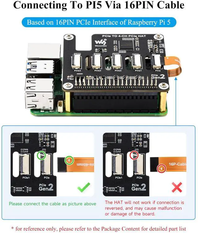 4-Ch PCIe FFC Adapter Board Compatible with Raspberry Pi 5, Expands The PCIe Interface Of The Pi 5 To 4-Ch PCIe FFC Connectors, Supports Stacking Multiple PCIe HATs. ^^ Connecting to PI5 via 16PIN Cable, based on 16PIN PCIe Interface of RPi 5. ^^ Expands 4-Ch PCIe Connectors. Flexible Combination for Easy Stacking of Multiple PCIe HATs. ^^ PCI-E1 only supports Gen2. Onboard working indicator, PWR stays on when powered on.