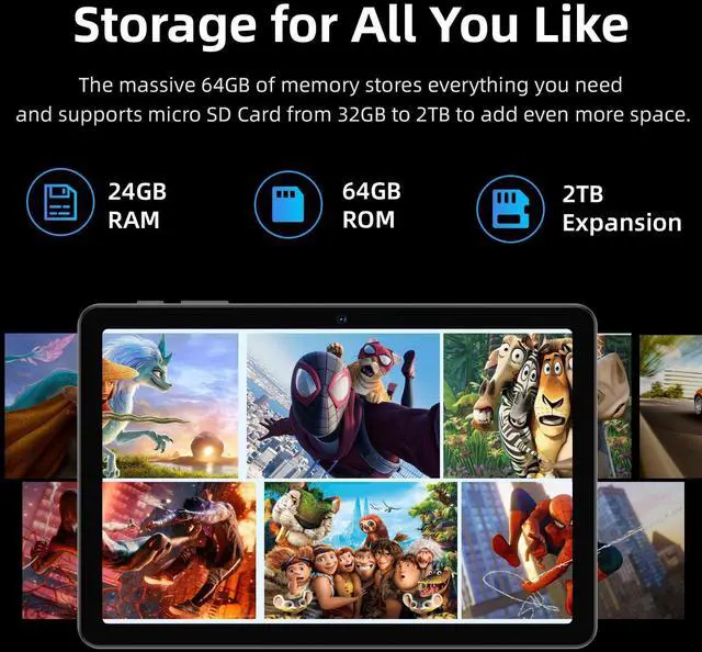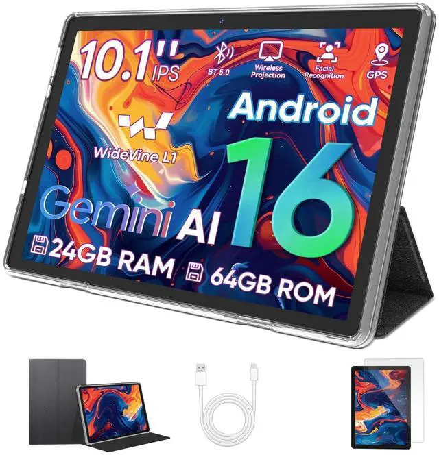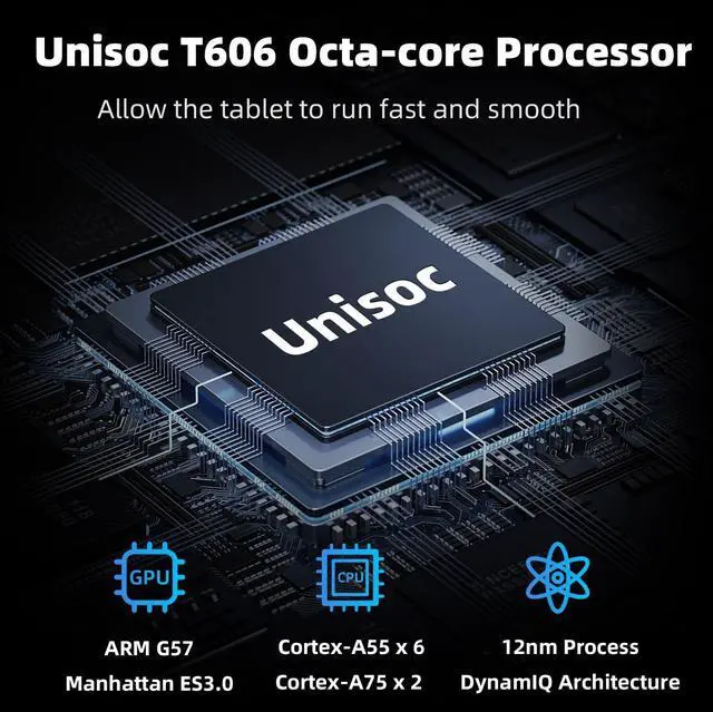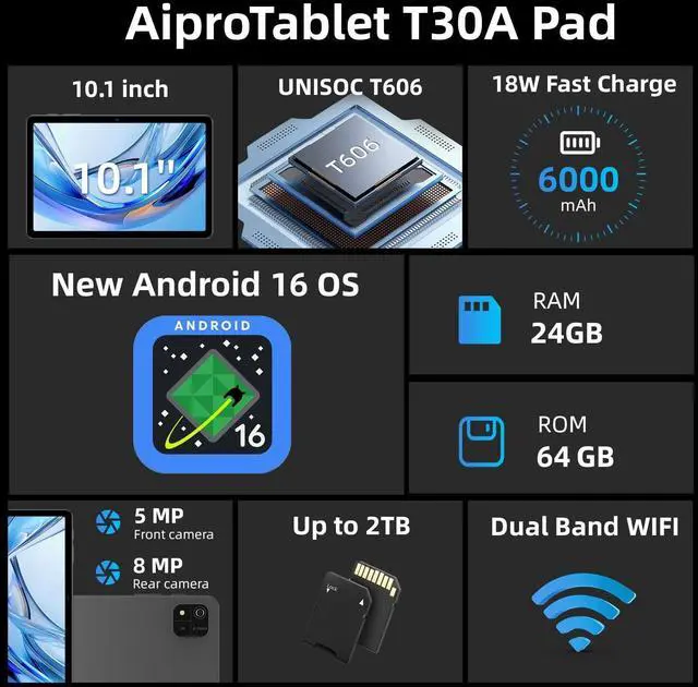 New Experience - The A30 Pad tablet is powered by the latest Android 16 OS, ensuring broader app compatibility, faster startup times, and improved responsiveness. The new system offers more customization, privacy, and security options, without the hassle of annoying ads. ^^ Ample Storage - The Android 16 tablet boasts 24GB LPDDR4x memory (4GB physical + 20GB virtual) and 64GB high-speed storage, expandable up to 2TB with a Micro SD card. Youll have ample space for all your favorite media, including videos, photos, and more. ^^ High Performance - Aiprotablet tablet is powered by the UNISOC T606 octa-core processor, featuring an ARM Cortex-A75 high-performance CPU and a Mali-G57 GPU, ensuring smooth and efficient operation of most apps and seamless multitasking.