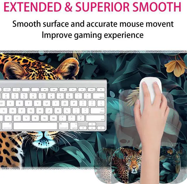 Large Gaming Mouse Pad + Mouse Wrist Rest Pad + Coaster Combination, 31.5 "x 11.8" Durable Non-Slip Extension Table Mat, Suitable for Office and Home, Leopard Jungle