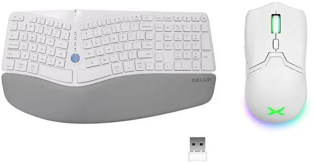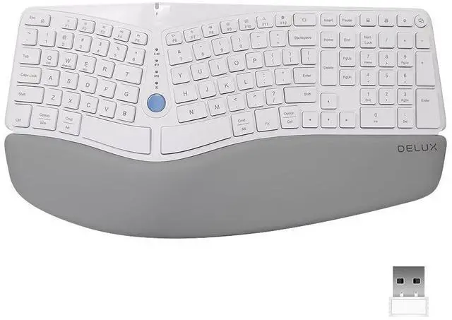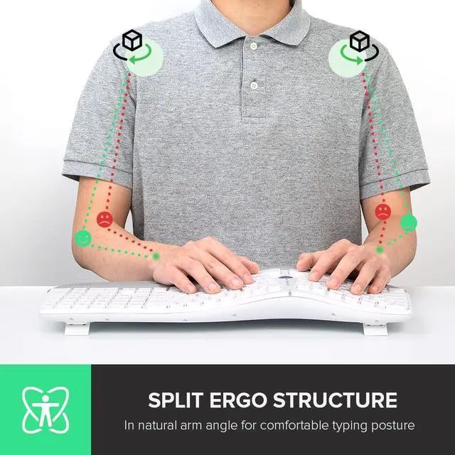 Curved and Split Ergonomic Keyboard Structure for Natural TypingHuman hand-friendly, designed by following human hands natural posture, compared with traditional keyboard, typing in a comfortable arm angle instead of contracting the arm to awful typing posture, reducing hands and wrists strain and shoulder pain. ^^ Dual Mode and Multi Devices Connection 2.4G with USB receiver and BT 5.0 with 2 channel (BT1 and BT2), use with up to 3 devices, easy installation and in-fly switching between different devices. ^^ Built-in Pillowed Wrist Rest with Skin-friendly Synthetic LeatherPlace your hand above it, lift from the ground and support the palm to keep the hands in the same level with keyboard rather than having to bend the palm or paying more effort to keep the palm lifted.