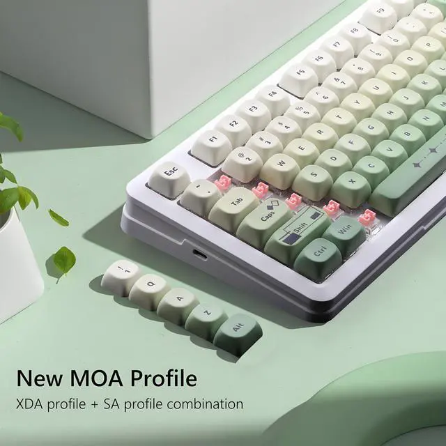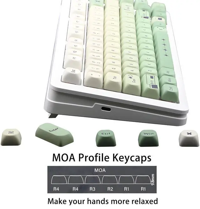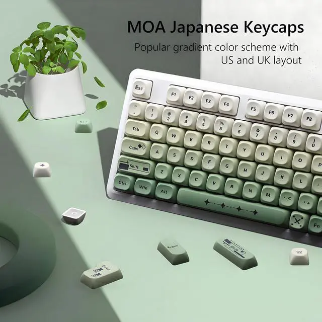 1.5 mm thick PBT KeycapsThese PBT keycaps are made of textured, high-grade PBT and are resistant to wear, friction, and solvents. Ensure a better user experience. ^^ 5 Side Dye Sublimation Keycap SetThe japanese key caps adopts advanced five-sided dye-sub process, the color pattern is more vivid, not afraid of oil stains, and has a long service life. ^^ MOA KeycapsThe new MOA profile keycap is prettier and cuter than the XDA keycap. It also ensures that the typing sound is more even, and makes the accent key simple but enjoyable.