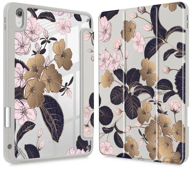 ICEKEE Case for iPad (A16) 11th Gen 11 Inch 2025, iPad 10th Gen 10.9 inch 2022 with Pencil Holder, Slim Printed Stand Protective Cover with Hard PC Translucent Back Shell Cover, Vintage Gold Sakura