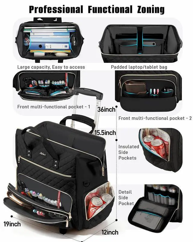 Compartmentalized Storage: The Awlcaw rolling teacher bag features 23 built-in pockets, effectively accommodating a 16-inch laptop and a 12.9 -inch tablet. It includes an insulated compartment for lunch, a main compartment for books and documents, four front pockets for glasses, pens, and other teaching tools, and a key fob to keep your teaching supplies organized ^^