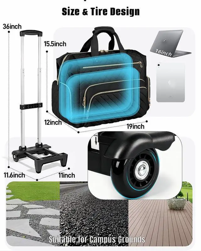 Trolley Designed: This wheeled tote bag ( 17.3 inches long x 10.5 inches wide x 13 inches high) features a detachable trolley and two smooth-running wheels for easy movement around. This wheeled laptop bag makes commuting easier and provides ample everyday storage space, making it ideal for teachers, counselors, and lecturers ^^ Tote