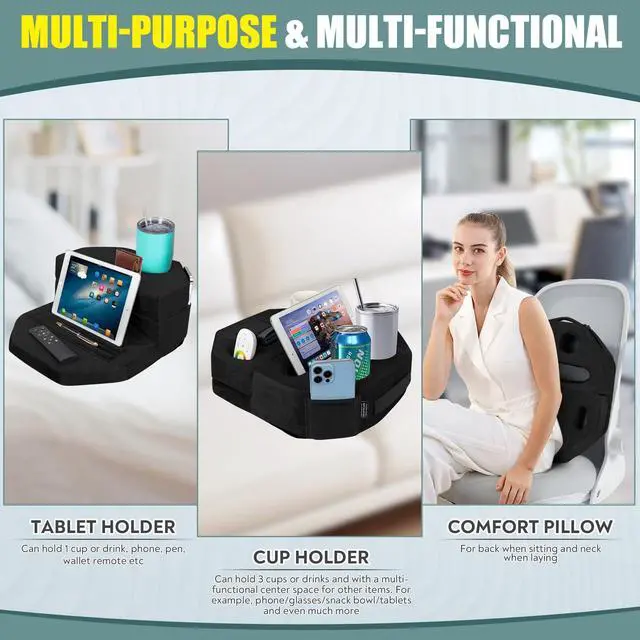 CONVENIENCE AT YOUR FINGERTIPS: TabCouchCaddy simplifies your daily routine with ease. It's more than just a cup holder; it's your go-to tablet and book holder and even transforms into a comfy neck pillow. Enjoy enhanced comfort and easy access to your essentials in various settings with this versatile and convenient Couch Cup and Tablet Holder Pillow. ^^