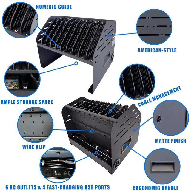 DEVICES: Easily powers and organizes up to 10 laptops, Chromebooks, tablets, or e-Readers (14"). Perfect for classrooms, offices, libraries, and tech-driven households.