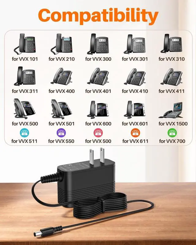 Compatibility: 48V charger compatible with VOIP Polycom VVX Models 101, 201, 300, 301, 310, 311, 400, 401, 410, 411, 500, 501, 511, 550, 600, 601, 611, 1500, CCX 500, 600,