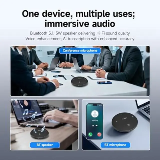 AI Noise Cancellation; Conference Mic uses advanced AI to distinguish human voice from background noise; Its algorithm actively suppresses echoes and distractions, delivering crystal-clear voice reproduction so everyone hears you and only you ^^ 360 Voice Pickup; Equipped with 4 built-in microphones, this conference speaker and microphone captures voices clearly from all directions in rooms up to 18 ft across; The 5W full-range Hi-Fi speaker recreating a true in-person meeting atmosphere ^^ Full-Duplex Audio; Bluetooth speaker with microphone with full-duplex technology allows everyone to speak freely without muting or waiting their turnjust like a face-to-face discussion; Experience natural interruption-free conversations ^^ True Plug-and-Play Setup; Get ready in seconds; Connect via USB or Bluetoothno drivers needed; One-click Mute Supported; Conference microphone compatible with Zoom, Teams, Skype, WebEx, and more; Includes NFC touch-pairing for instant connection with supported apps ^^ Wide Compatibility; Computer speaker works seamlessly with Windows & macOS, plus all major conferencing platforms like Google Meet and Teams;