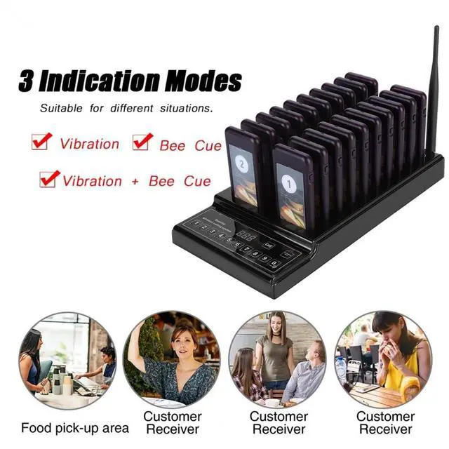 3 Alert Modes: 20 channel pager with ringing, vibration, LED indicator alerts. It is not only suitable for quiet occasion, but also for noisy occasion. 2.