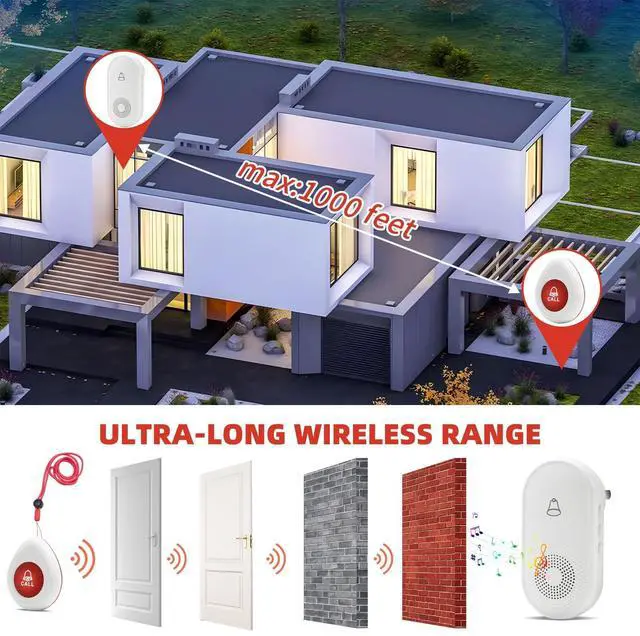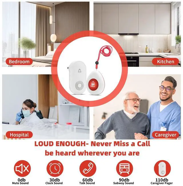 Your Family & Patient: If you have elderly, disabled or sick people to take care of, the call button can remind you to help your family members in time while you are resting/working/doing housework, without the need to yell to get someone's attention. Caregiver pager is suitable for family members, hospitals, nursing homes and care facilities. ^^ Easy to use and carryReady to use out of the box without pairing. The receiver can be moved with caregivers to the bedroom, kitchen, bathroom, or yard. The call button can be conveniently hung around the neck with a hanging rope, or installed on the wall with double-sided tape or screws (the package includes hanging rope, double-sided tape, and screws). Support a 1000 ft operating range in open areas to ensure you don't miss any distress signals. ^^ 55 Music and 5 Level Volume ReceiverWireless caregiver pager call has 55 ringtones for you to choose from. Volume is adjustable in 5 levels from 0 dB to 110 dB. The care pager is dust and water resistant. ^^ ExpandableSupports pairing between multiple receivers, you can add more transmitters and receivers (same model) as needed, thus expanding your existing calling system.