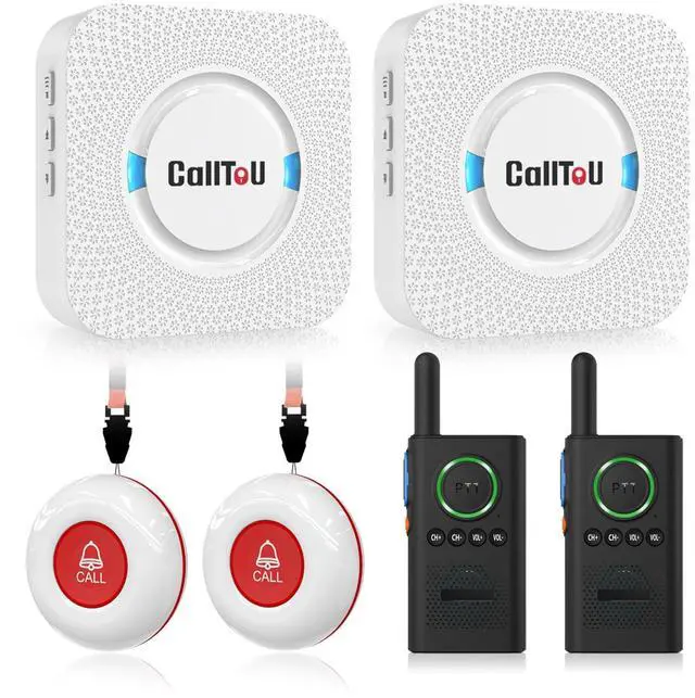 Two-way radios allow for easy conversation and no need to hold down buttons ^^ [ Meeting Daily Caretaking Needs ] The working range of the pager system is 500FT in the open area. The obstacles indoor will affect the signal. We recommend that keep working range less than 300FT indoor. ^^ [ Smart Ringtones ] The receiver of caregiver pager has 55 ringing tones to choose from and 5 level adjustable volume from 0db to 110db. Press the volume keys to adjust the volume level. Easy use by plug the receiver into an electrical outlet ^^ [ High Quality ] Both call button and receiver are waterproof and dustproof.