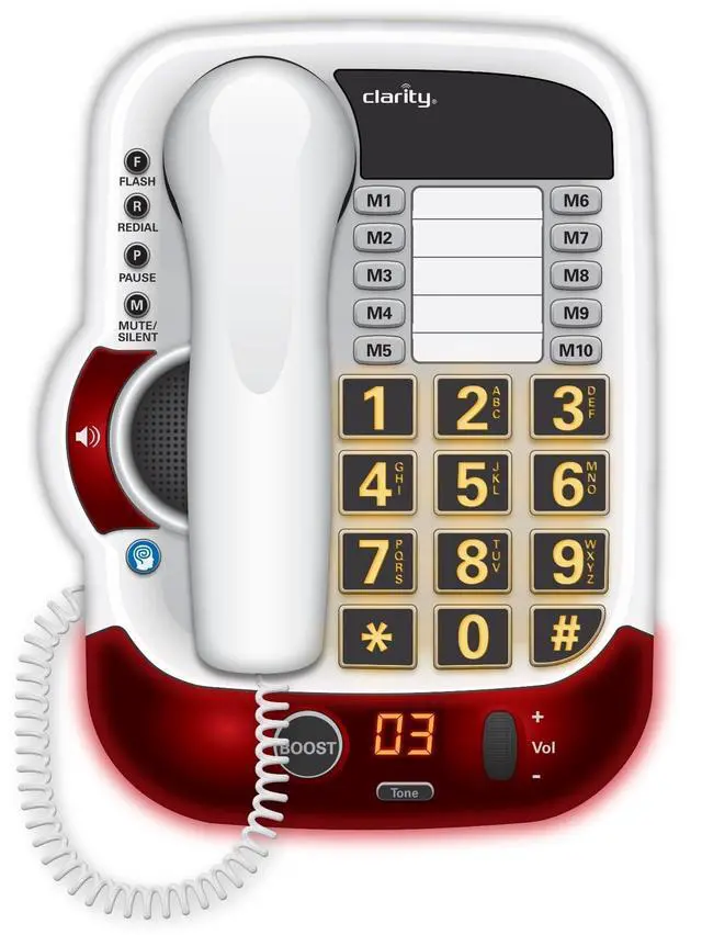 Amplifies incoming sounds up to 53 db. And outgoing speech up to 15 db. ^^ Digital clarity power incorporates hearing aid technology for clearer call quality ^^ Extra loud ringer volume (100 DBA) ^^ Battery backup lets you make calls when the power goes out