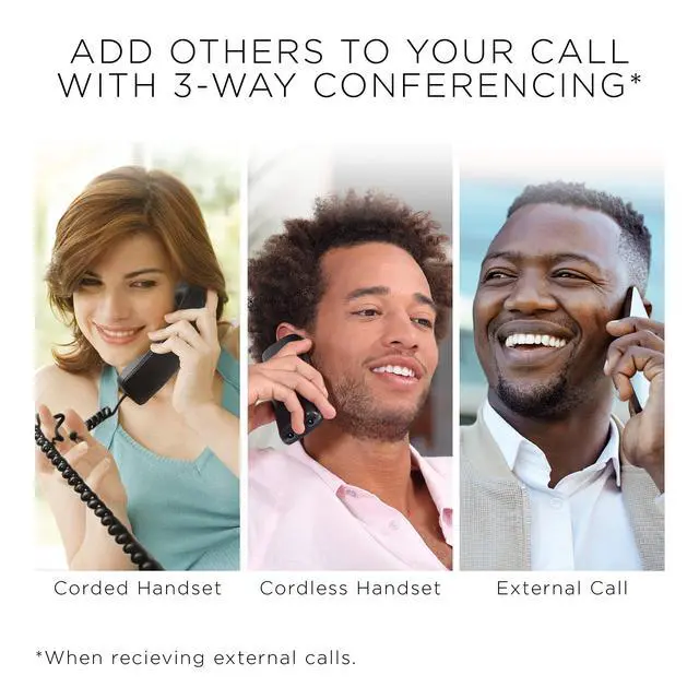 Corded + Cordless Phone - C4202 is a black corded phone system with ergonomic cordless handset ideal for both office spaces and home use ^^ Hands-Free Conversations - Phone combo features a speakerphone on both so you can take calls without a headset and multi-task while in meetings or talking with friends ^^ Multiple Contact Phonebook - Telephone system holds up to 50 entries and includes convenient built-in answering machine to take messages when you're unavailable ^^ Phone Intercom System - Phone offers 3-way conferencing with simultaneous intercom and features an easy-to-read bright blue LED display ^^ Includes - One (1) corded phone and two (2) cordless handsets with base, four (4) batteries, three (3) power adapters, setup guide