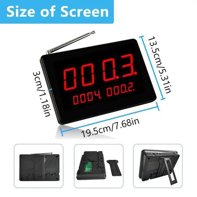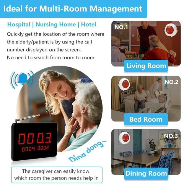 Broad ApplicationThe wireless caregiver pager is suitable for various situations, such as clinic, nursing home, hospital, health centre, postnatal rehabilitation centre, child welfare agency and so on. Particularly ideal for the elderly, disabled, bedridden patients, pregnant women, children in emergency calls. ^^ Clear Voice BroadcastThe number display have 8 different reminder voices in 10 levels of volume. The most commonly used is "Number xxx CALL" or "Dingdong" voice, clear voice prompts allow help seekers to get the assistance faster. And can also set "mute" if you don't want to use the voice prompts and only display the number.