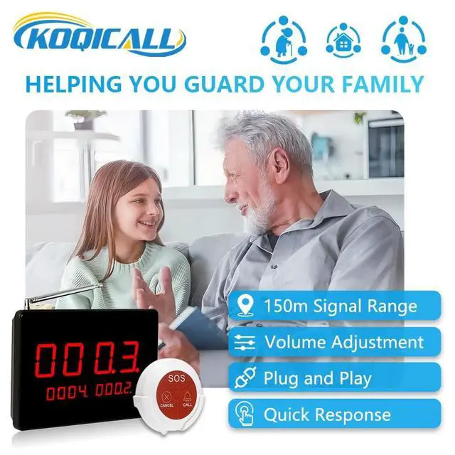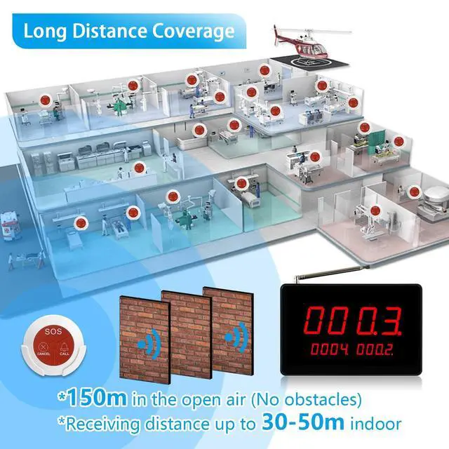 ^^ Long Signal RangeWith an operating range of up to 500 feet in open areas, the care pager meets the distance requirements of most environments and is especially suitable for upstairs and downstairs calls in small clinics/nursing homes. If indoors, the call button has a signal distance of 30-50 metres due to obstacles such as walls, doors and windows. ^^ Plug and PlayThe nurse call light system is wireless and requires no wiring. The call button is paired with the display receiver prior to shipment and does not require any internet access, it is ready to use when powered on.