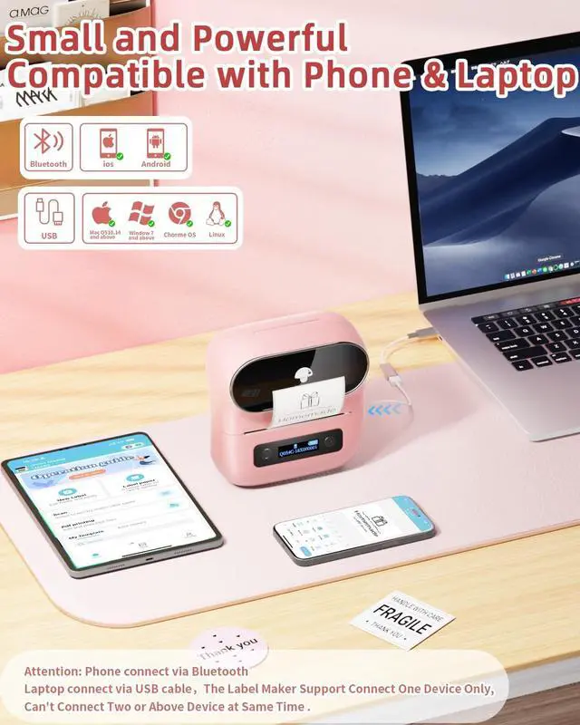 Cost-Effective Thermal Printing - Professional Bluetooth label maker with advanced thermal technology No ink, toner, or ribbons required! Print 0.78" - 3.14" wide labels (rolls only) at 50% lower cost vs. inkjet printers. Choose from transparent and black/white thermal labels for home, office, or small business needs ^^ Smart Multi-Device Compatibility -
