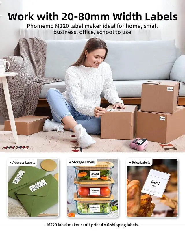 Wireless & Wired Flexibility: Seamlessly connect via Bluetooth (iOS/Android) or USB (Compatible with Windows 10/Mac ). Use as a portable mobile label printer or desktop label maker. Supports phone/tablet (Free "Print Master" App) and PC/laptop ("Labelife" Software) ^^ Free Pro-Level Design Tools - Phomemo's Exclusive "Print Master" App No fees, no ads! Create labels with 400+ fonts, 700+ templates, 6000+ icons, QR/barcodes, OCR, voice input, and image uploads. Preview & save designs. High-resolution output for branding logos, address labels, QR codes, and more. ^^ Ultimate Versatility & Durability - 2200mAh Rechargeable Battery Print 36+ rolls per charge with 2-week standby. Compatible with square/round/cable/file labels ( 0.78" - 3.14" ). Waterproof & smudge-proof for jars, inventory tags, outdoor equipment. Perfect for retail, warehouses, home organization. ^^ Plug-and-Play Efficiency - 3-Step