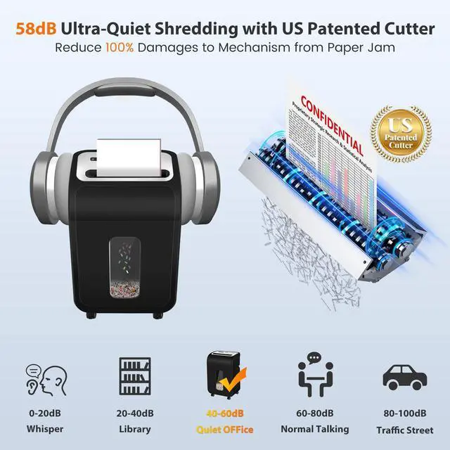 Ultra-Quiet Working: 58 dB low noise creates the quiet and comfortable atmosphere. Also, US patented blade can prevent 99% damages to shredder from paper jam and prolong its life span. It is ETL certified product with one year protection ^^