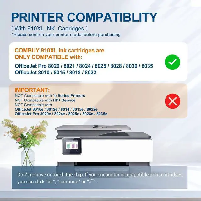 Printers Compatibility: 910XL Ink Cartridges for HP Printers Officejet Pro 8020 8021 8024 8025 8028 8030 8035, Officejet 8010 8015 8018 8022 Printers ^^ DON'T WORK with HP Officejet 8010e, 8012e, 8014e, 8015e, 8018e, Officejet Pro 8022e, Pro 8020e, 8024e, 8025e, 8028e, 8035e Printer ^^ Latest chip versionOur 910xl ink cartridges combo pack equipped with the latest chip version to ensure working compatibility with your printer ^^