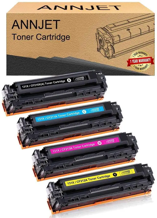 Authenticity certificationANNJET compatible toner cartridges replacement for HP 131A 131X CF210A CF210X are manufactured in an ISO 9001 & ISO14001 certified facility. All Toner Cartridges are engineered to produce superb results. Packing specificationBlack CF210X, Cyan CF211A, Magenta CF213A, Yellow CF212APage output131X black toner cartridges: 3000 Pages & 131A color toner cartridges: 1, 800 Pages at 5% coveragePrinter compatible modelsHP Pro 200 color M251nw, Pro 200 color M251n, Pro 200 color MFP M276nw, Pro 200 color MFP M276n Laser PrinterDetails & Accuracy: High-end toner cartridges can manage complicated image rendering. Every single bit of spark will reappear on print work.