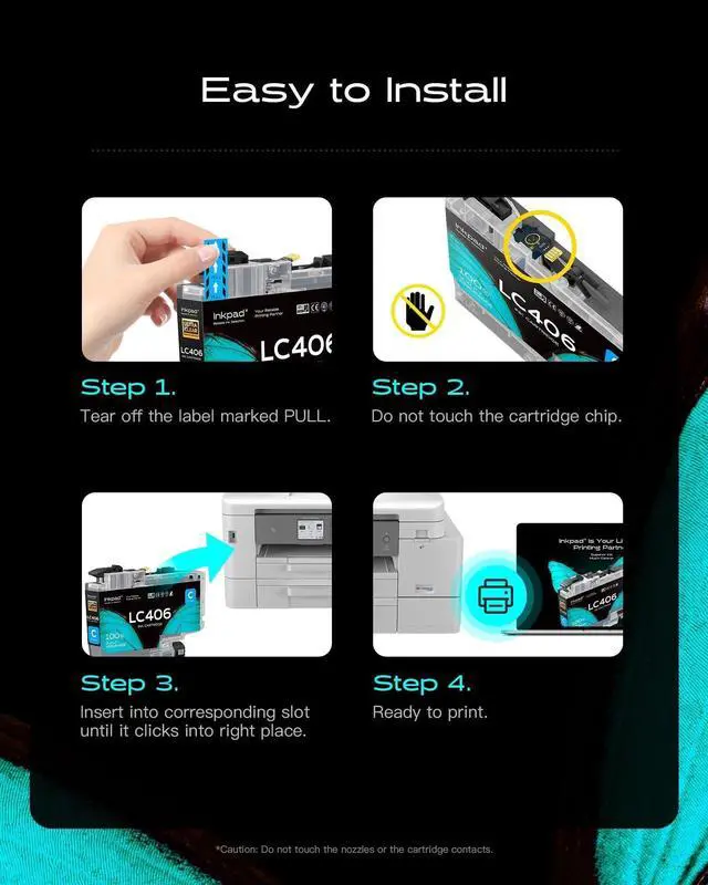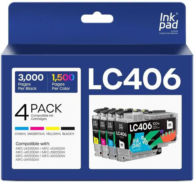 ^^ Impressive Page Yield: Maximize your printing efficiency with our iNKPAD compatible LC 406 ink cartridges high-yield performance. Get up to 3, 000 pages for black ink and 1, 500 pages for color ink cartridges, allowing you to tackle large printing tasks with ease. (at 5% coverage of A4 paper) ^^