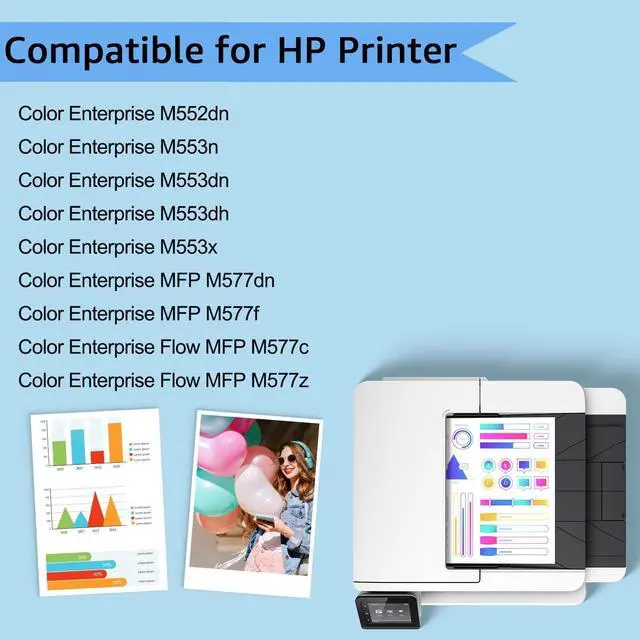HP Printer: Color Enterprise M552dn, M553n, M553dn, M553dh, M553x, MFP M577dn, MFP M577f; Flow MFP M577c, Flow MFP M577z. ^^ KCMYTONER Toner delivers the reliable printing results: sharp text, clear images, vivid color, crisp graphics and resists-fading/smudging. Easy to install. Perfect partner with your printer and copier. Perfect compatibility.