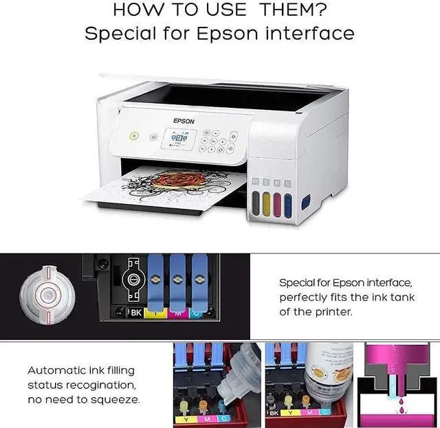 Special for Epson interface. Perfectly fits the ink tank of the Special for Epson interface. Perfectly fits the ink tank of the printer, Automatic ink filling status recogination, no need to squeeze, no longer have the trouble of filling ink with syringe. printer, Automatic ink filling status recogination, no need to squeeze, no longer have the trouble of filling ink with syringe. ^^ Sublimation Ink Refilled for Epson All Sublimation Printers. High quality sublimation transfer printing ink refills for EPSON WorkForce WF7710 WF7720 WF3640 WF2860 WF2750 WF2650 WF2850 WF3720 WF845 ET2720 ET2750 ET2650 ET2760 ET2550 ET3700 XP440 XP446 XP400 printer.