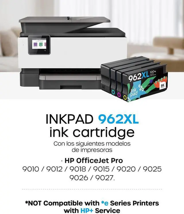 Attention: 962 ink cartridges NOT compatible with OfficeJet Pro models 9010e, 9012e, 9014e, 9015e, 9018e, 9019e, 9020e, 9022e, 9025e, and 9028e.