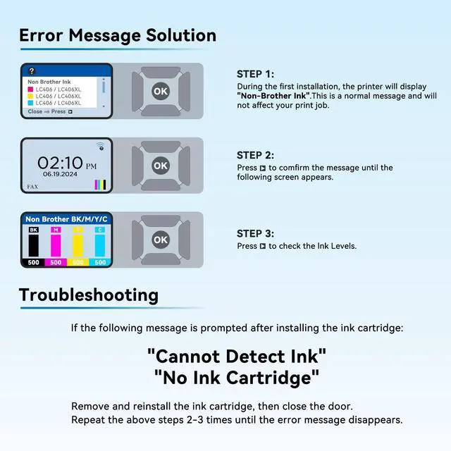 Warm Tip: If prompted for this Printer error "cartridge not recognized", "The printer does not have enough ink", Please reinstall the cartridge to turn it off and on once until it is recognized; When the printer prompts "non-original", please click OK or Next to continue
