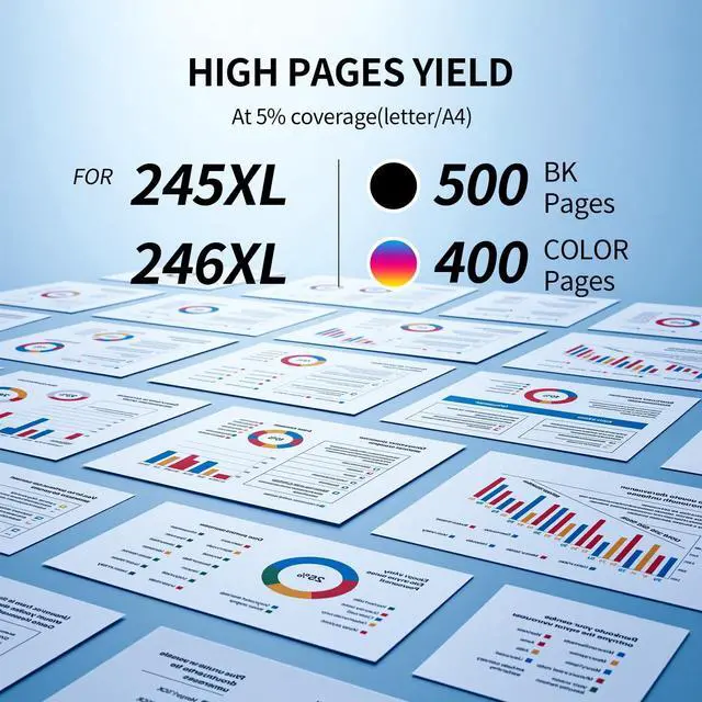 High Page Yield: up to 400 Pages for each 245XL Black Ink Cartridge and 300 Pages for each 246XL Tri-Color Ink Cartridge at 5% coverage of Letter Size. Maximize your printing efficiency with these high-yield cartridges. ^^ Compatible with