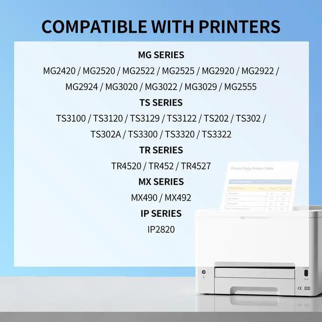 Canon Printers: for use in Canon PIXMA iP2820, MG2420, MG2520, MG2920, MG2922, MG2924, MX492, TS3120, TS3122, MG3022, TS302, TR4520, TR4550, TR4522, PIXMA TS3322, MX490, MG2555, MG3020, MG2525, MG2522, TS3129, TS3320, iP2810, MG2410, MG2510, MG3010, ensuring optimal functionality.
