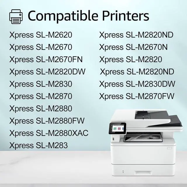 Samsung Printer: SL-M2830 SL-M2830DW SL-M2880 SL-M2880FW SL-M2880XAC SL-M2870 SL-M2870FD SL-M2870FW SL-2820 SL-2820DW SL-2820ND SL-M2670 SL-M2670FN SL-M2670N SL-M2620 SL-2620ND; Xpress SL-M2620 / Xpress SL-2620ND / Xpress SL-2820 Xpress / SL-2820DW / Xpress SL-2820ND / Xpress SL-M2670 / Xpress SL-M2670FN / Xpress SL-M2670N / Xpress SL-M2870 / Xpress SL-M2870FD / Xpress SL-M2870FW / Xpress SL-M2830 / Xpress SL-M2830DW / Xpress SL-M2880 / Xpress SL-M2880FW /SL-M2880XAC. ^^ Compatible toner cartridges provide same performance and printing as genuine cartridge. Our cartridges are made of quality materials: smart chip, toner powder, smooth OPC & roller and industrial grade packaging. Make your presentations and printouts stand out with GREENCYCLE toner cartridge that produces clear, crisp, bold, and eye-catching text and graphics that keep people awake at your next meeting.