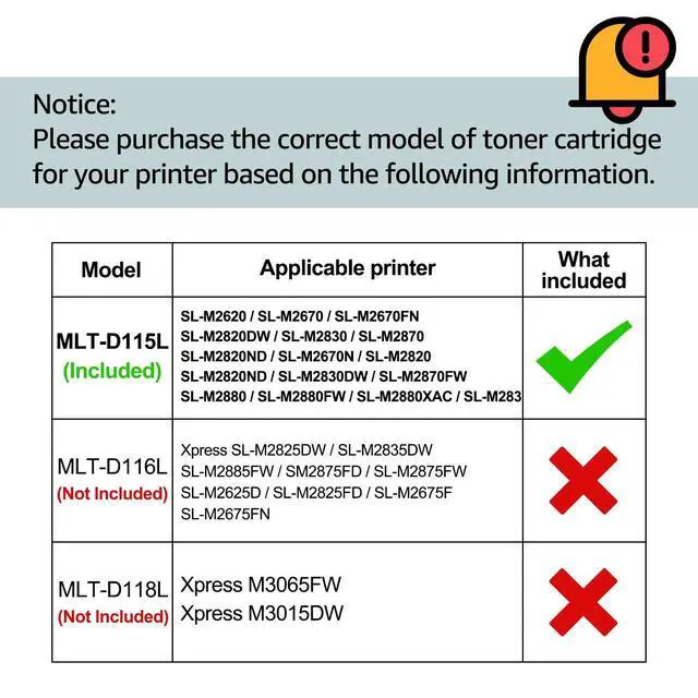 ^^ Page Yield: Up to 3, 000 pages per MLT-D115L black toner cartridge (based on 5% coverage of Letter size Paper). Actual toner yield varies with usage, graphics printed and environmental conditions. ^^ Compatible for