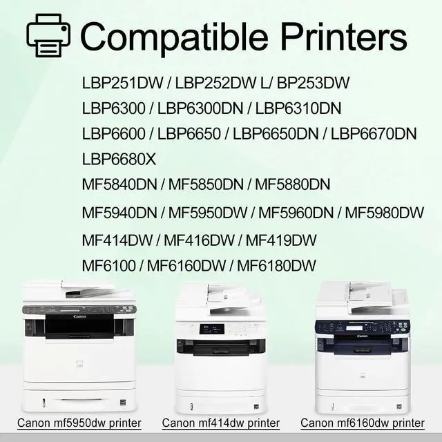 Canon Printer: ImageCLASS MF5800 MF5850dn MF5880dn; ImageCLASS MF5900 MF5950dw MF5960dn; ImageCLASS MF6100 MF6160dw; ImageCLASS MF410 MF414dw MF416dw MF419dw; LBP6600 LBP6670dn LBP6650dn; LBP6300 LBP6300dn LBP6310dn; LBP250 LBP251dw LBP252dw LBP253dw.